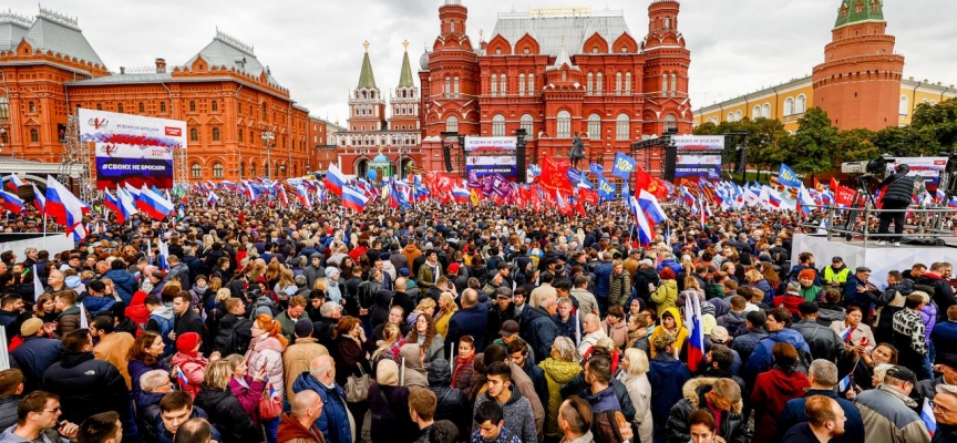 Rusya’da Kremlin Sarayı yakınlarındaki Manej Meydanı’nda bir araya gelen göstericiler Donbas, Zaporijya ve Herson bölgelerine yönelik destek sloganları attı.