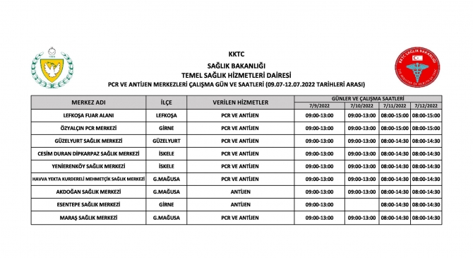 Sağlık Bakanlığı’ndan yapılan açıklamada Lefkoşa, Girne, Gazimağusa, Güzelyurt ve İskele’de 9 merkezin bayram boyunca hizmet vermeye devam edeceği bildirildi.