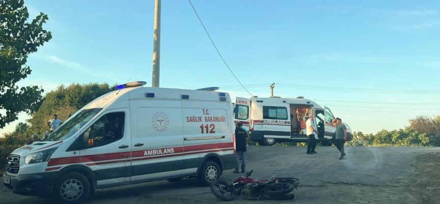 Yol kenarına devrilen motosikletin sürücüsü ile araçtaki Umut Baltaoğlu yaralandı.