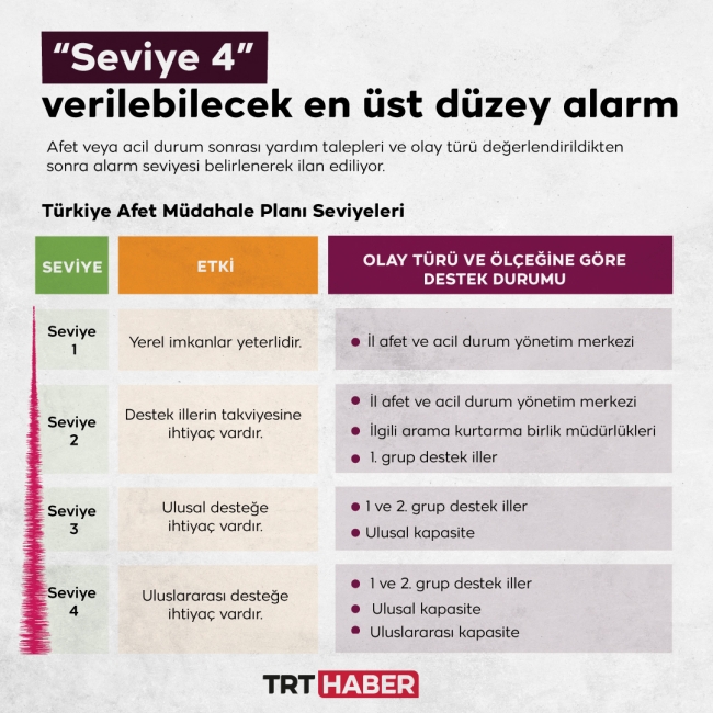 Etki derecesi konusunda ulusal desteğe ihtiyaç duyulan alarm seviyesi ise Seviye 3… Belirlendiğinde olay seviyesi ilan edilir ve Afet ve Acil Durum Koordinasyon Kurulu toplanır. Bu durumda 1. ve 2. grup destek iller ile ulusal kapasitede destek gerekiyor.