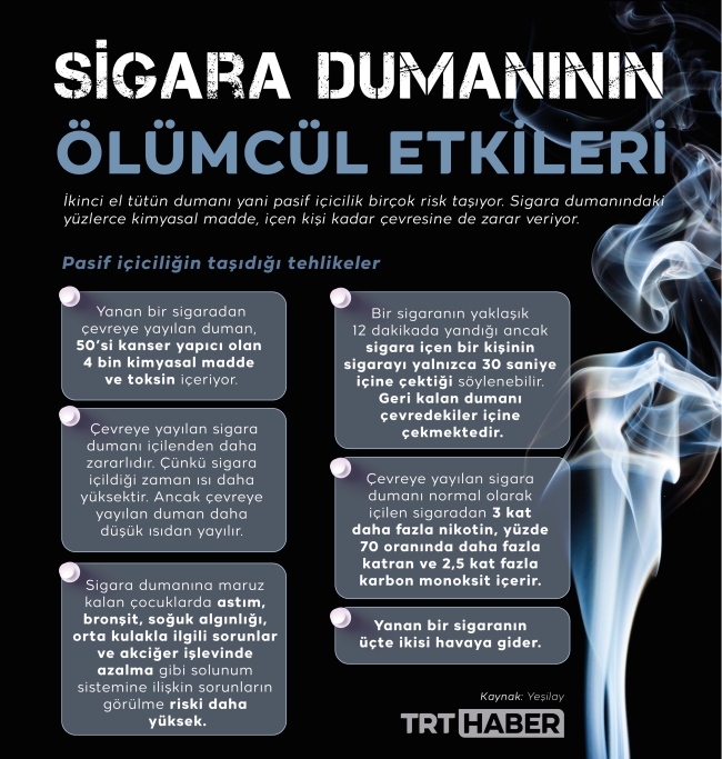 Sigaranın zararı sadece içen kişiye etkisi ile sınırlı değil. Halk arasında bilinen tabiri ile pasif içicilik diğer bir tanımı ile ikinci el tütün dumanı toplum sağlığı açısından önemli bir risk. Yeşilay verilerine göre; yanan bir sigaradan çevreye yayılan duman, 50’si kanser yapıcı olan 4 bin kimyasal madde ve toksin içeriyor.