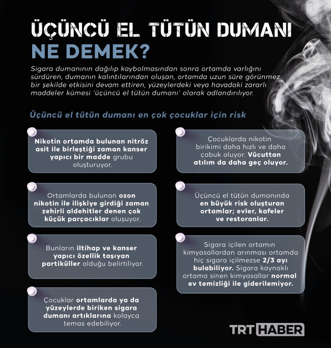 Üçüncü el tütün dumanında ise ikinci el dumandaki zehirlerin etkilerini görüyoruz. Fakat bunlardan birine özellikle değinmek istiyorum. O da nikotin. Nikotinin bağımlılık yapıcı özelliği çok yüksek. Aynı zamanda önemli bir zehir. Nikotin ortamda bulunan nitröz asit ile birleştiği zaman kanser yapıcı bir madde grubu oluşturuyor. Üçüncü el tütün dumanının kanser yapıcı etkisi hayvanlarda denendi ve kanser yapıcı etki gösterdiğini biliyoruz. Şimdi düşünürsek, içen kişi sigaradan bir miligram nikotin alıyor. Ama içtiği çevreye 8 miligram nikotin saçıyor. Bu nikotinin ortamda sürekli bulunduğunu düşünün. Yani yüzeylere tutunuyor. Tozlara tutunuyor. Çocuklar bu tozlara, yüzeylere devamlı değiyor. Elleriyle bunu alıyor ve ağızlarına götürüyorlar. Çocuklarda nikotin birikimi daha hızlı ve daha çabuk oluyor. Vücuttan atılım da daha geç oluyor.”