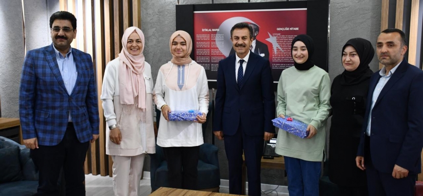 Sivas'ta tam puan alan Zeki Hayran İmam Hatip Ortaokulu öğrencisi Reyyan Duman ve özel bir okulun öğrencisi Ayşe Zümra Aksu, aileleriyle İl Milli Eğitim Müdürü Ergüven Aslan'ı ziyaret etti.
