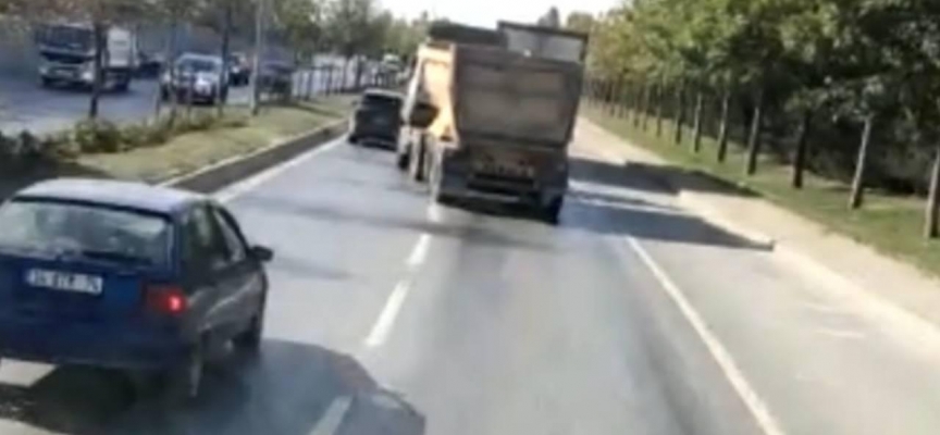 Hem kendisini hem de trafikteki diğer sürücüleri tehlikeye atan hafriyat kamyonu şoförü dakikalarca sollamalar yaparak yoluna devam etti.