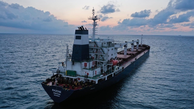 Cumhurbaşkanı Recep Tayyip Erdoğan'ın himayesinde, 22 Temmuz'da Türkiye, Rusya, Ukrayna ve BM arasında imzalanan "Tahıl ve Yiyecek Maddelerinin Ukrayna Limanlarından Emniyetli Sevki Girişimi Belgesi" kapsamında Odessa Limanı'ndan Lübnan'ın Tripoli Limanı'na doğru yola çıkan Sierra Leone bayraklı, 27 bin ton mısır taşıyan "Razoni" adlı gemi, dün saat 21.00 sıralarında kendisine Rumelifeneri açıklarında tahsis edilen alana demirledi.