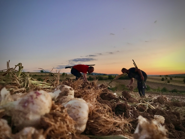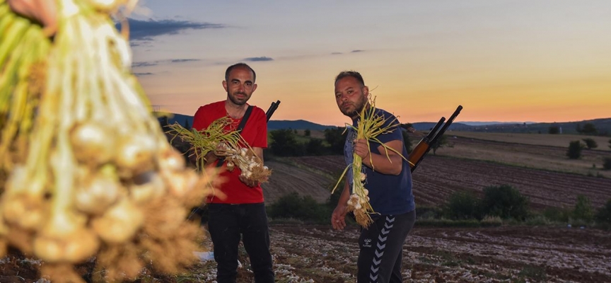 Sarımsak hasadı yapan çiftçiler, ürünlerini kuruması için 15 gün tarlada bırakıyor. Bu süre içinde hırsızlık olayının yaşanmaması için gündüz hasat yapan çiftçiler geceleri de tarlada nöbet tutarak emeklerini koruyor.