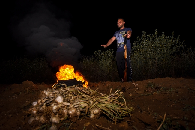 Sabaha kadar nöbet tutan çiftçiler, gece geç saatlerde ateş yakarak ısınıyor.