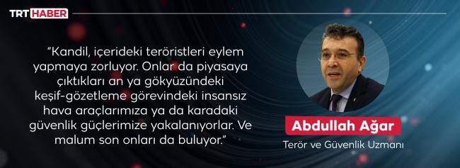 Abdullah Ağar, bu baskı nedeniyle içerideki sözde üst düzey teröristlerin kimi zaman harekete geçtiğini söylüyor. Sonrasını da “Ama piyasaya çıktıkları an yerel istihbarata, sinyal istihbaratına, keşif-gözetleme görevindeki insansız hava araçlarımıza ya da karadaki güvenlik güçlerimize yakalanıyorlar. Ve malum son onları da buluyor” sözleriyle anlatıyor.