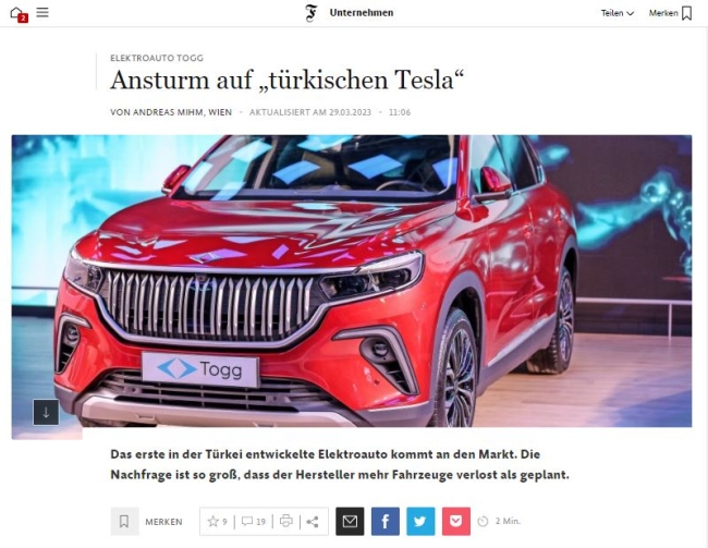 Alman Frankfurter Allgemeine Zeitung gazetesi, Togg'u manşetine taşıdı. Gazete "Türk Teslası TOGG’a yoğun rağbet var" başlığını attı.