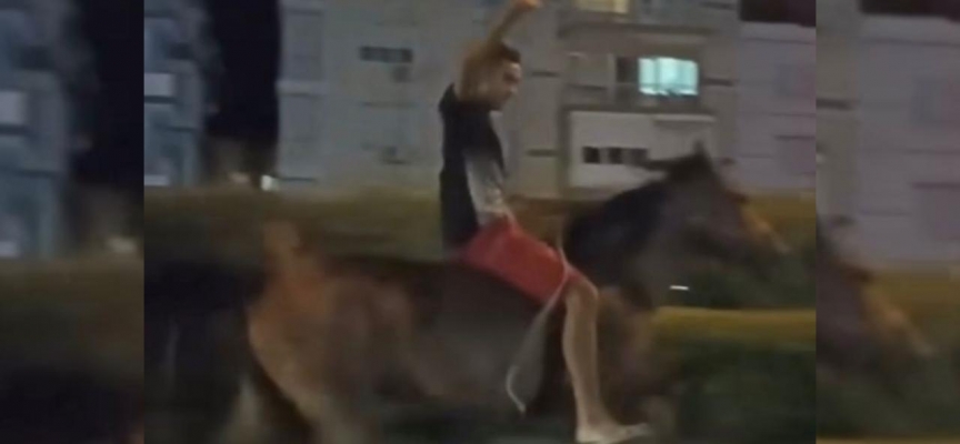 Atla hızla ilerleyen kişi görüntülendiğini anlayınca kameraya el salladı.