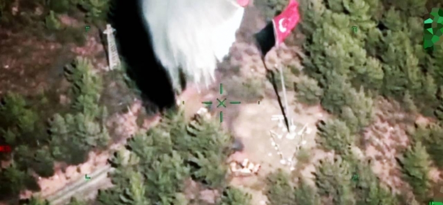 Helikopter tarafından bölgeye su atılması ve yer ekiplerinin iş makinesi ile koordineli çalışması sonrası Türk bayrağı alevlere teslim edilmedi.