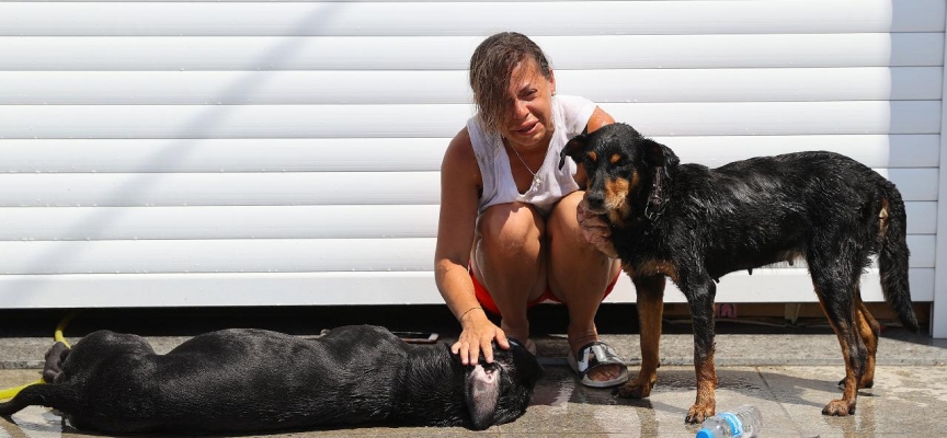 İtfaiye ekiplerince camı kırılan araçtaki köpekler dışarı çıkarıldı.