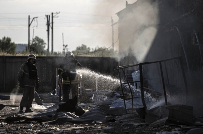 Yoğun çatışmaların sürdüğü Donetsk cephe hattına yaklaşık 20 kilometre uzaklıkta bulunan şehrin bir semtinde yer alan sanayi yapılarına Rus güçlerince fırlatılan füzeler isabet etti.