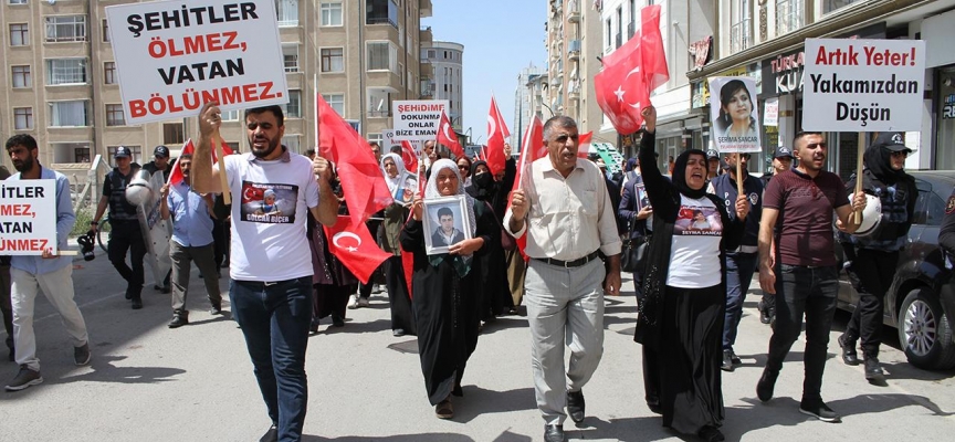 Cumhuriyet Caddesi'nde bir araya gelen aileler, "Şehitler ölmez, vatan bölünmez", "Şehidime dokunma, onlar bize emanet", "Anneler HDP'yi lanetliyor", "Evlat nöbetindeyiz", "Artık yeter, yakamızdan düşün", "Çocuklarımız kimsenin piyonu olmayacak" ve "Van anneleri evlat nöbetinde" yazılı dövizler taşıdı.