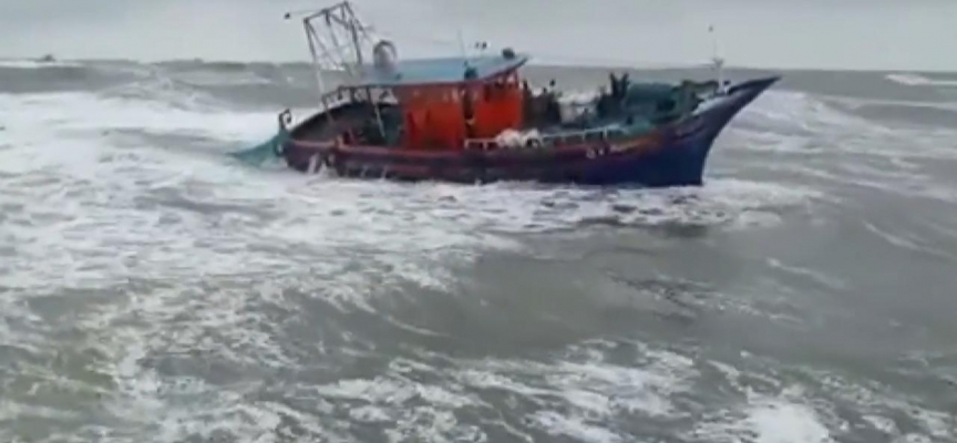 Hindistan'ın Kerala eyaletine bağlı Kollam açıklarında şiddetli fırtınaya yakalanan bir balıkçı teknesi yan yattı.