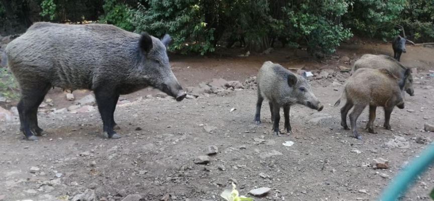 Otel bahçesine gelen domuzlar bir süre sonra bölgeden ayrıldı.