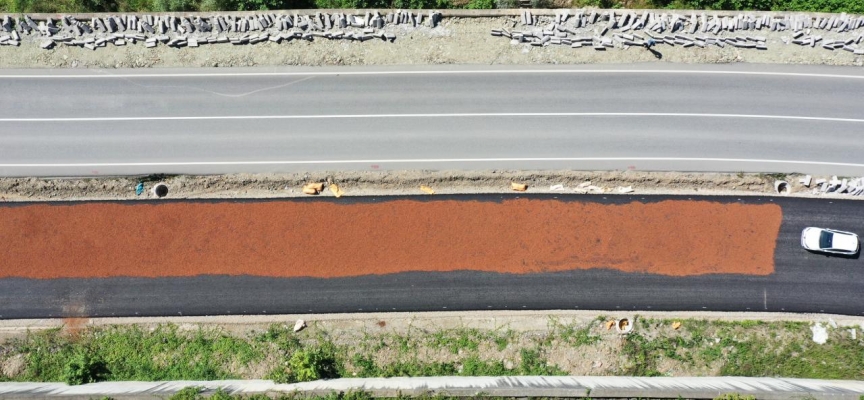 Bazı üreticiler fındığını, yapımı süren Giresun-Dereli kara yolunun bölünmüş yol olarak inşa edilip asfalt çalışmaları tamamlanmış ancak ulaşıma açılmamış kısımlarında kurutuyor. Fındığı gün boyunca karıştıran üreticiler, ürünü çuvallayacakları zamanı bekliyor.