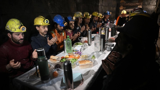 Yerin altındaki kömürün yeryüzüne çıkarılmasında başrolde olan madenciler, iftarın ardından dua edip ocaktaki mesailerine devam ediyor.